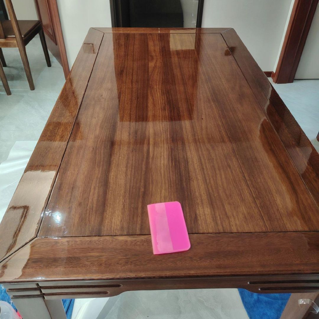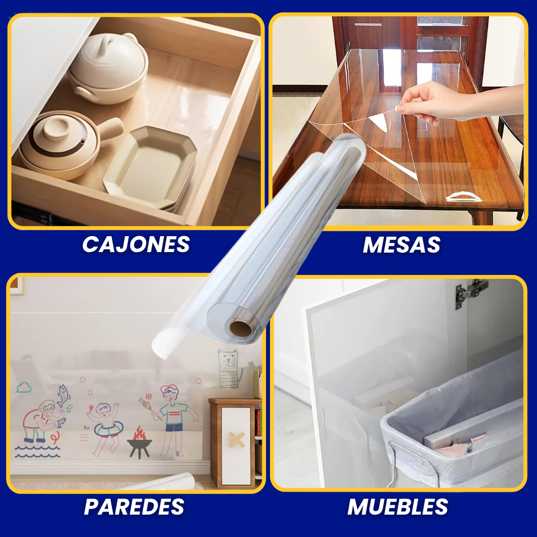 Esta lámina transparente, resistente al calor, al agua y al aceite, se adhiere fácilmente y mantiene tus muebles como nuevos durante años.