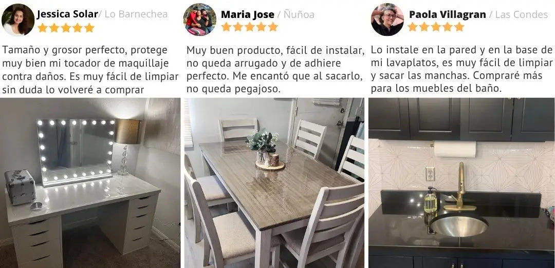 👉 Cualquier superficie lisa: madera, cristal, mármol, granito, cerámica o metal. Ideal para mesas, encimeras, escritorios, muebles de baño o tocadores.